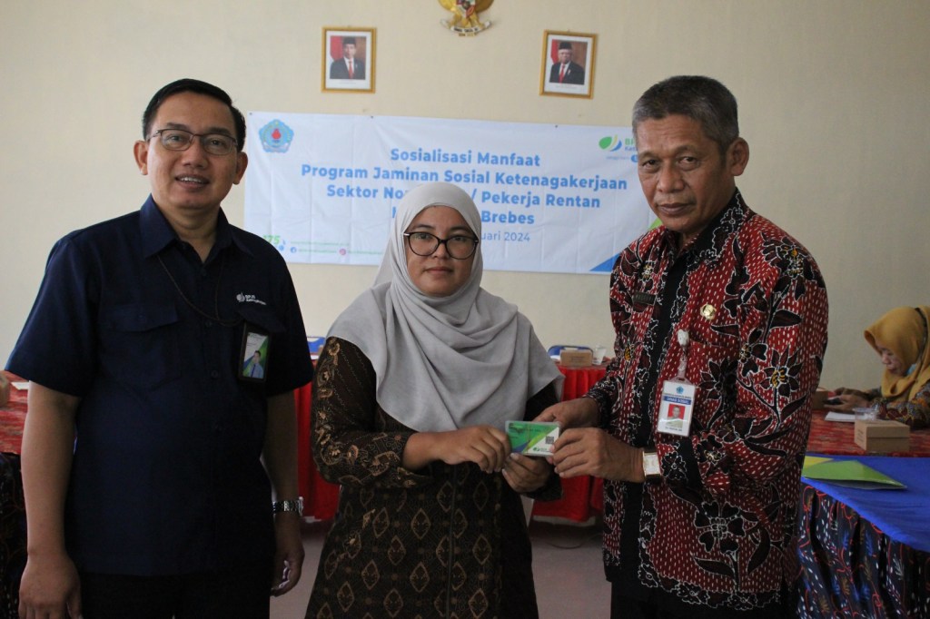 Sebanyak 7.500 Warga Brebes pekerja non formal mendapat jaminan BPJS Ketenagakerjaan, premi sebesar Rp16.800,- per bulan per orang itu dibayar Pemerintah Kabupaten Brebes. Kartu BPJS Ketenagakerjaan untuk tahun 2024 telah diserahkan kepada warga peserta melalui Kasie Kesejahteraan Sosial (Kesos) kecamatan masing-masing di sela Sosialisasi Manfaat Program Jaminan Sosial Ketenagakerjaan Sektor Non formal’Pekerja Rentan Kabupaten Brebes, di Kantor Dinas Sosial, Selasa (27/2/2024)