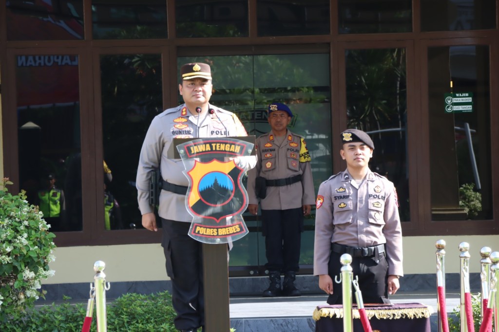 Brebes – Kapolres Brebes AKBP Guntur M Tariq memimpin upacara korp raport kenaikan pangkat pengabdian kepada salah seorang angotanya yang bertugas dijajaran Polres Brebes, Senin (4/3/2024).