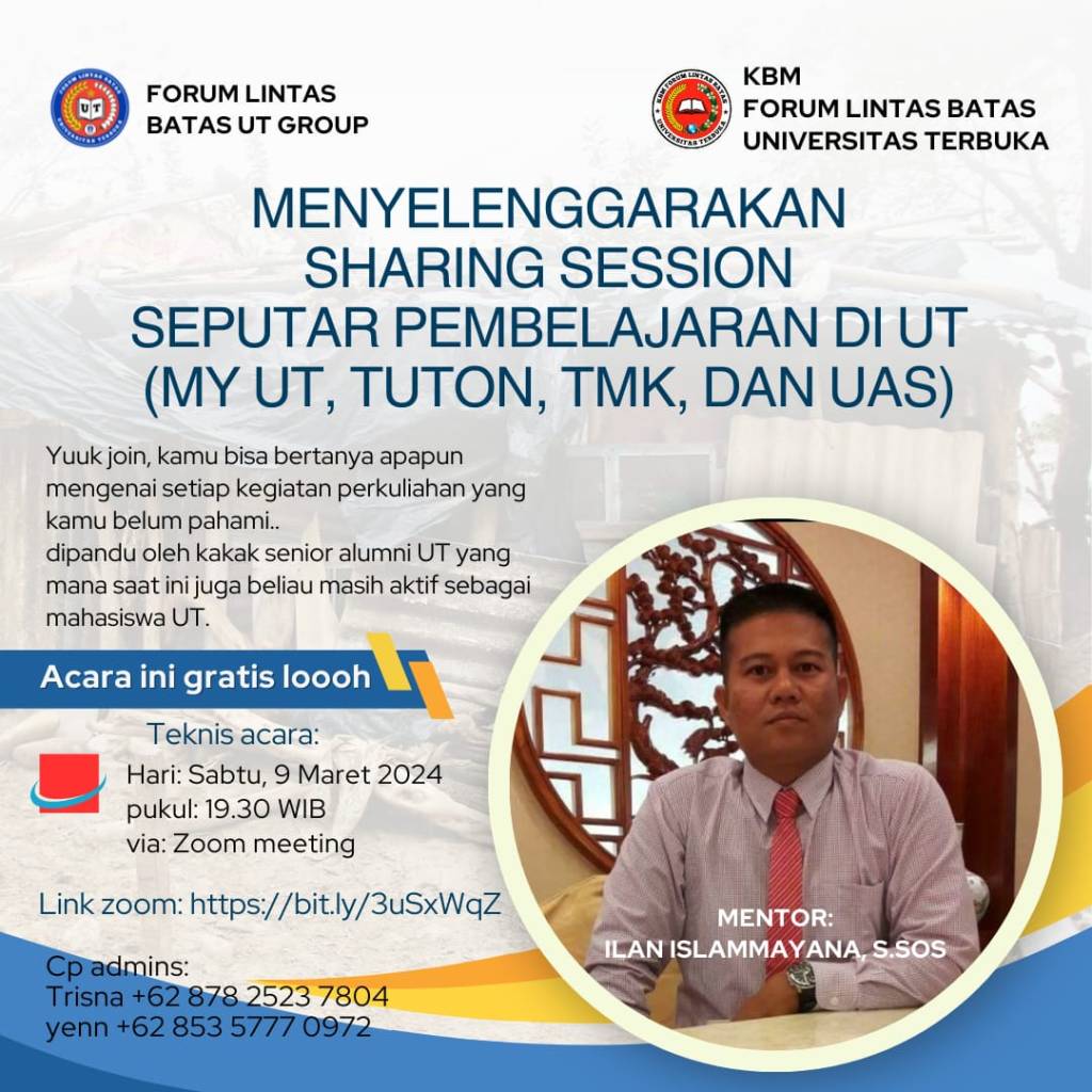 Kembali lagi nih, KBM FORUM LINTAS BATAS UNIVERSITAS TERBUKA, akan mengadakan sharing session seputar kegiatan perkuliahan di Universitas Terbuka ini..