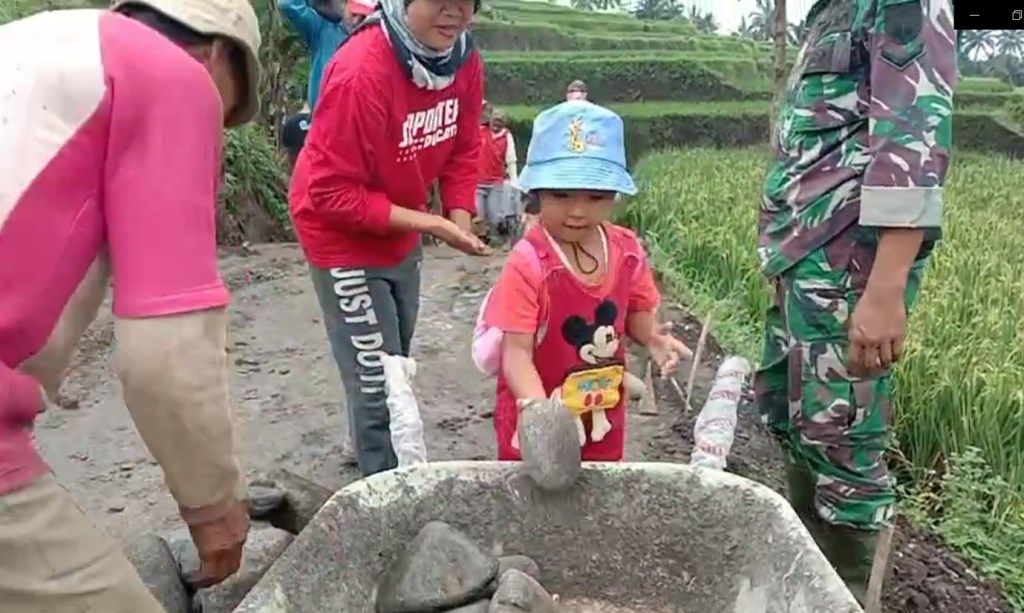 Bukan hanya orang dewasa hingga orang tua yang berjibaku dengan personil prajurit satgas dan sejumlah anak-anak begitu antusias dan bersemangat angkut material untuk dijadikan bahan pengecoran jalan.