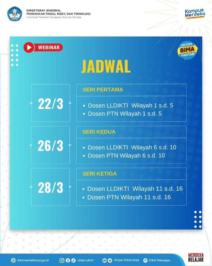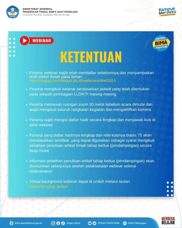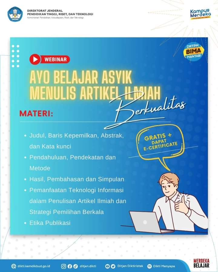 Ditjen Diktiristek melalui Direktorat Riset, Teknologi, dan Pengabdian kepada Masyarakat (DRTPM) mengundang seluruh dosen untuk hadir secara daring mengikuti Webinar Pelatihan Penulisan Artikel Ilmiah yang akan dilaksanakan sebanyak tiga sesi.