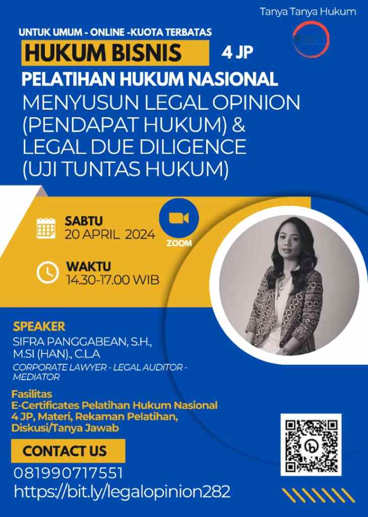 LEGAL WORKSHOP-UMUM-KUOTA TERBATAS 30 PESERTA – Pelatihan Hukum Nasional 4 JP: Merangkai Legal Opinion (LO) & Legal Due Diligence (LDD) / Uji Tuntas Hukum ,