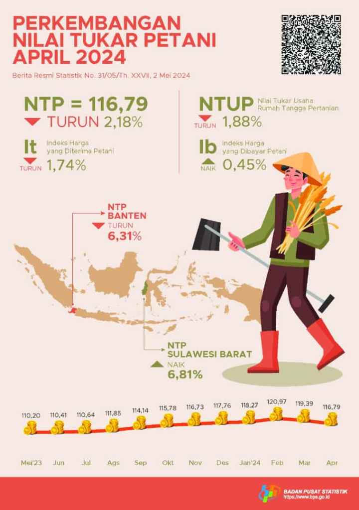 - Nilai Tukar Usaha Rumah Tangga Pertanian (NTUP) nasional April 2024 sebesar 120,25 atau turun 1,88 persen dibanding NTUP bulan sebelumnya.