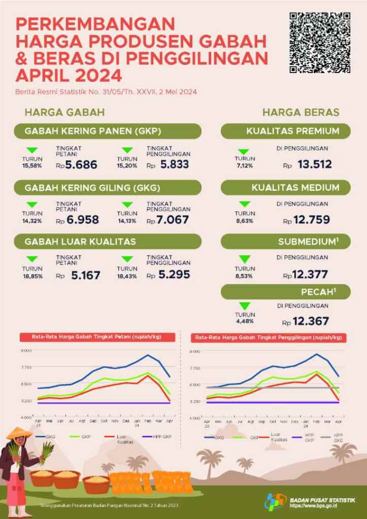 - Pada April 2024, rata-rata harga beras kualitas premium di penggilingan sebesar Rp13.512,00 per kg, turun sebesar 7,12 persen dibandingkan bulan sebelumnya, sedangkan beras kualitas medium di penggilingan sebesar Rp12.759,00 per kg atau turun sebesar 8,63 persen, beras kualitas submedium sebesar Rp12.377,00 atau turun sebesar 8,53 persen, dan rata-rata harga beras pecah di penggilingan sebesar Rp12.367,00 per kg atau turun sebesar 4,48 persen.