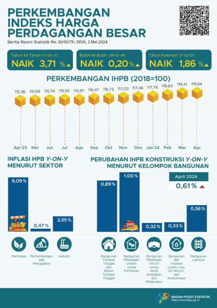 - Pada April 2024, perubahan Indeks Harga Perdagangan Besar (IHPB) Umum Nasional tahun ke tahun (y-on-y) sebesar 3,71 persen terhadap IHPB April 2023. Kenaikan IHPB tertinggi terjadi pada Sektor Pertanian, yaitu sebesar 9,09 persen.