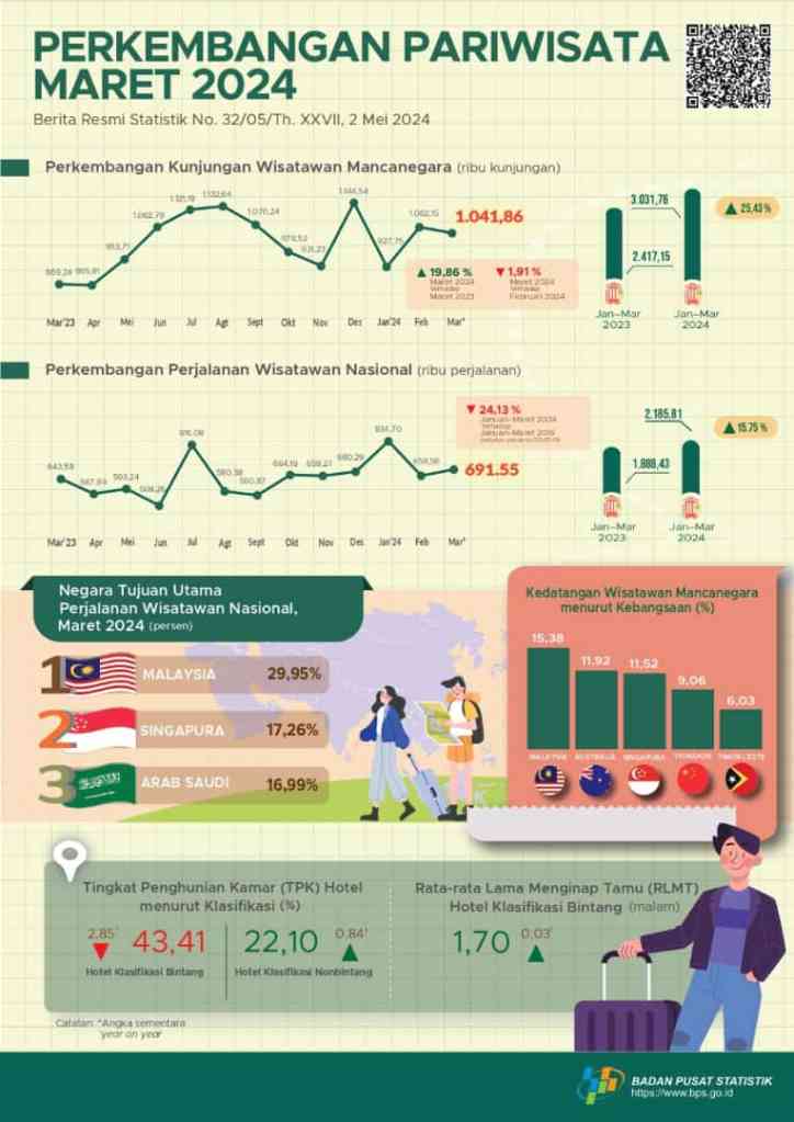 - Pada Maret 2024, kunjungan wisatawan mancanegara (wisman) di Indonesia mencapai 1,04 juta kunjungan. Jumlah ini turun sebesar 1,91 persen dibandingkan Februari 2024 month-to-month (m-to-m) dan naik 19,86 persen dibandingkan bulan yang sama pada tahun lalu (y-on-y). Wisman yang berkunjung ke Indonesia pada Maret 2024 didominasi oleh wisman yang berasal dari Malaysia (15,38 persen), Australia (11,92 persen), dan Singapura (11,52 persen).