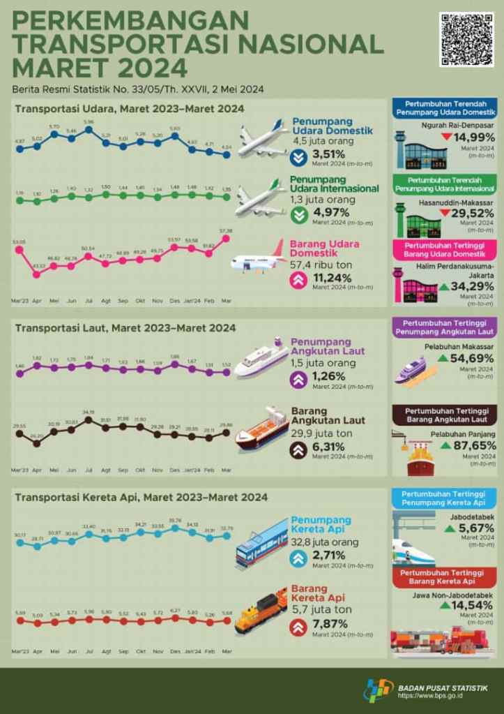- Jumlah penumpang angkutan laut dalam negeri yang berangkat pada Maret 2024 tercatat 1,5 juta orang atau naik 1,26 persen dibanding Februari 2024. Jumlah barang yang diangkut naik 6,31 persen menjadi 29,9 juta ton. Selama Januari–Maret 2024, jumlah penumpang mencapai 4,7 juta orang atau naik 8,85 persen dibanding dengan periode yang sama tahun 2023, sementara jumlah barang yang diangkut naik 0,15 persen atau mencapai 86,5 juta ton.
