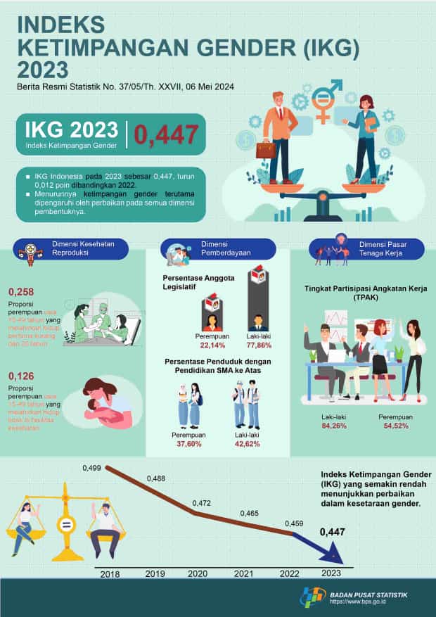- Indeks Ketimpangan Gender (IKG) Indonesia 2023 sebesar 0,447, turun 0,012 poin dibandingkan tahun sebelumnya.