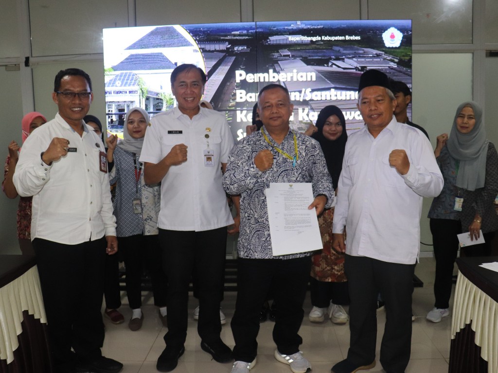 Penyerahan bantuan pelatihan kerja kepada karyawan karyawati swasta secara simbolis oleh PJ Bupati Brebes Iwanuddin Iskandar SH MHum disaksikan Kepada Baperlitbangda Apriyanto Sudarmoko, Ketua APINDO Edy Suryono dan Ketua Baznas Kab Brebes Abdul Haris.