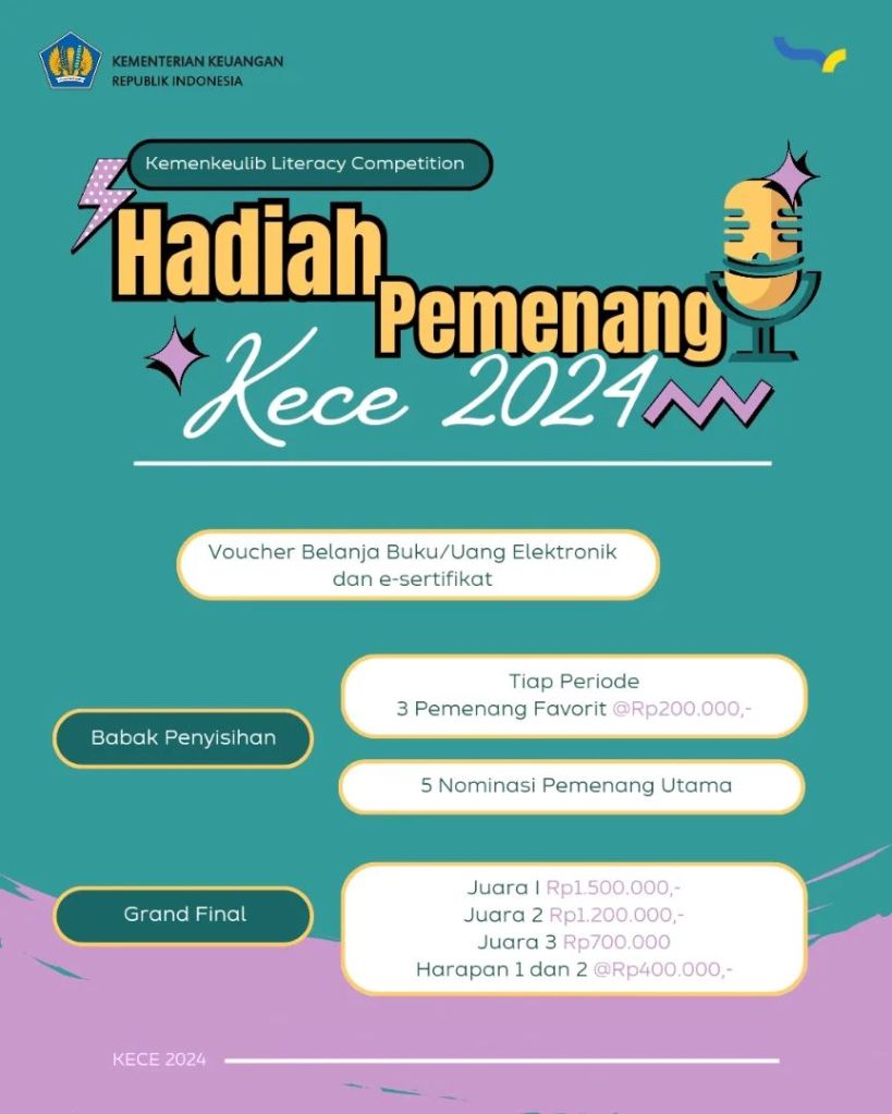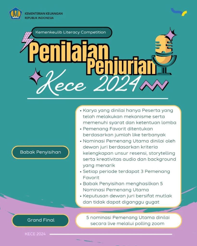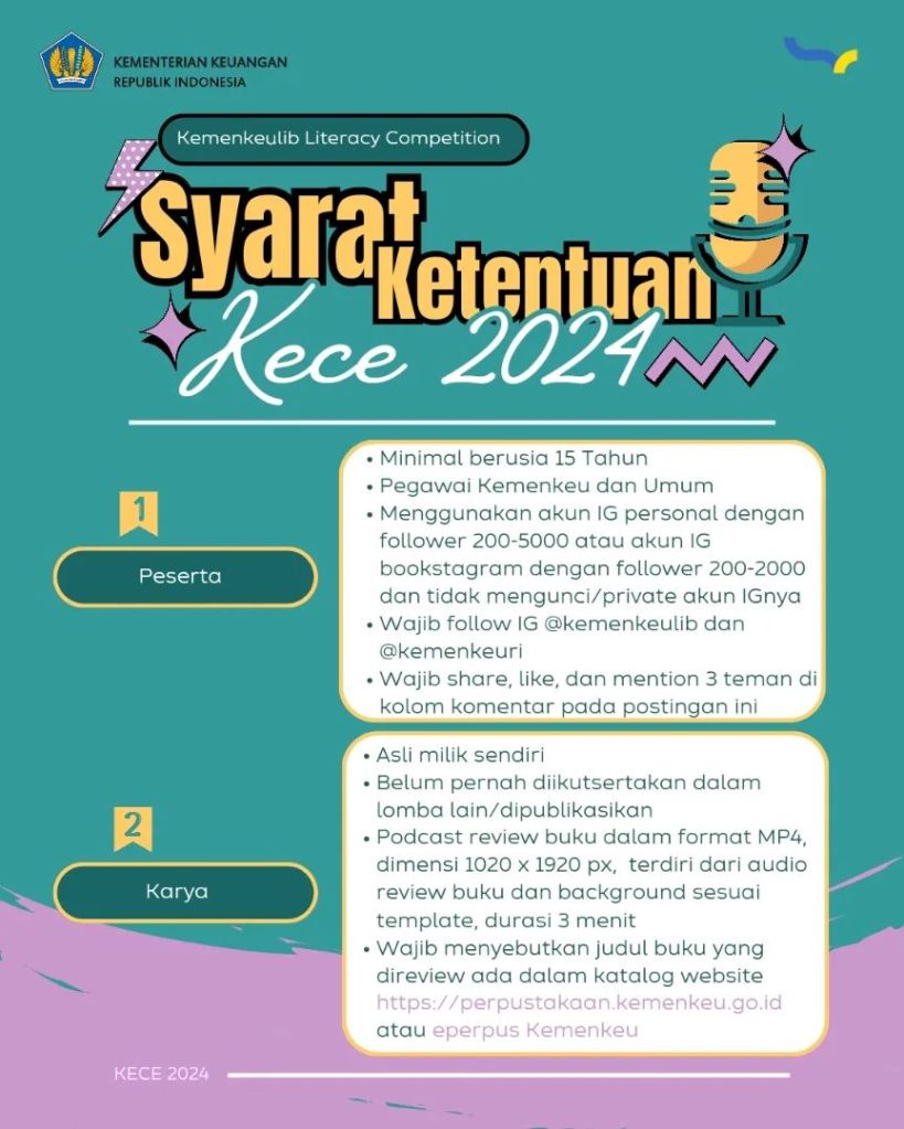 Mau review buku dapat hadiah total 6 juta rupiah? Yuk ikutan Kemenkeulib Literacy Competition 2024: “3 Minutes Podcast Bookish Review Challenge”. Yuk, posting rekaman suara review buku yang ada dalam katalog Perpustakaan Kemenkeu sesuai syarat & ketentuan dan daftarkan dirimu pada link berikut: https://bit.ly/kece2024