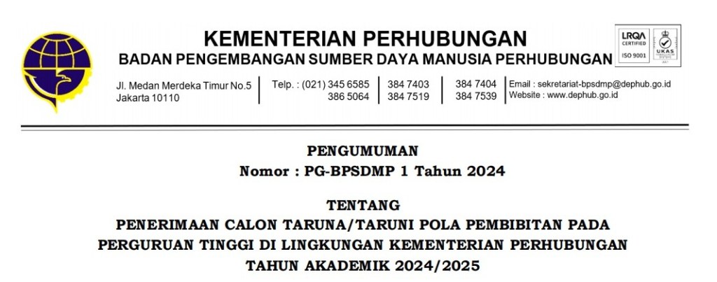 PENERIMAAN CALON TARUNA/TARUNI POLA PEMBIBITAN PADA PERGURUAN TINGGI DI LINGKUNGAN KEMENTERIAN PERHUBUNGAN TAHUN AKADEMIK 2024 / 2025 pg-bpsdmp-1-tahun-2024-tentang-penerimaan-calon-taruna-taruni-2024Unduh Bagikan ini: Bagikan ke X(Membuka di jendela yang baru) X Bagikan pada Facebook(Membuka di jendela yang baru) Facebook Bagikan ke WhatsApp(Membuka di jendela yang baru) WhatsApp Bagikan ke Telegram(Membuka di jendela yang baru) Telegram Cetak(Membuka di jendela yang baru) Cetak Kirim email tautan ke teman(Membuka di jendela yang baru) Surat elektronik Suka Memuat... Terkait Tinggalkan komentar Batalkan balasan Δ