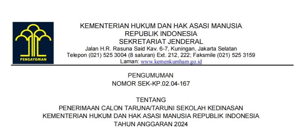 PENERIMAAN CALON TARUNA/TARUNI SEKOLAH KEDINASAN KEMENTERIAN HUKUM DAN HAK ASASI MANUSIA REPUBLIK INDONESIA TAHUN ANGGARAN 2024 pengumuman-penerimaan-calon-taruna-taruni-sekolah-kedinasan-kemenkumham-ri-tahun-anggaran-2024Unduh Bagikan ini: Bagikan ke X(Membuka di jendela yang baru) X Bagikan pada Facebook(Membuka di jendela yang baru) Facebook Bagikan ke WhatsApp(Membuka di jendela yang baru) WhatsApp Bagikan ke Telegram(Membuka di jendela yang baru) Telegram Cetak(Membuka di jendela yang baru) Cetak Kirim email tautan ke teman(Membuka di jendela yang baru) Surat elektronik Suka Memuat... Terkait Tinggalkan komentar Batalkan balasan Δ