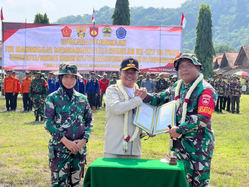 BREBES— Program TNI Manunggal Membangun Desa (TMMD) ke-127 Tahun 2026 resmi dibuka melalui upacara pembukaan yang digelar di Lapangan Desa Cikuya, Kecamatan Banjarharjo Kabupaten Brebes.Selasa(10/2/2026)