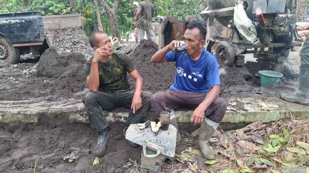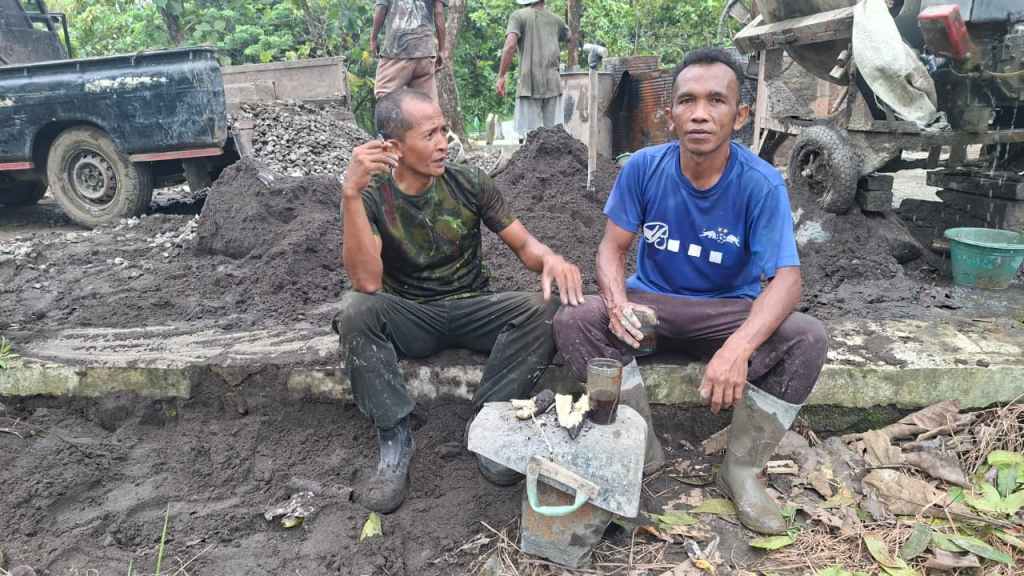 Setelah berjibaku dengan material bangunan dan cuaca yang menantang, dua anggota Satgas TMMD dari Kodim 0713/Brebes, Serka Lantoro dan Kopka Amrin Johan, nampak menikmati masa istirahat sejenak di lokasi kerja pada Rabu (11/02/2026).