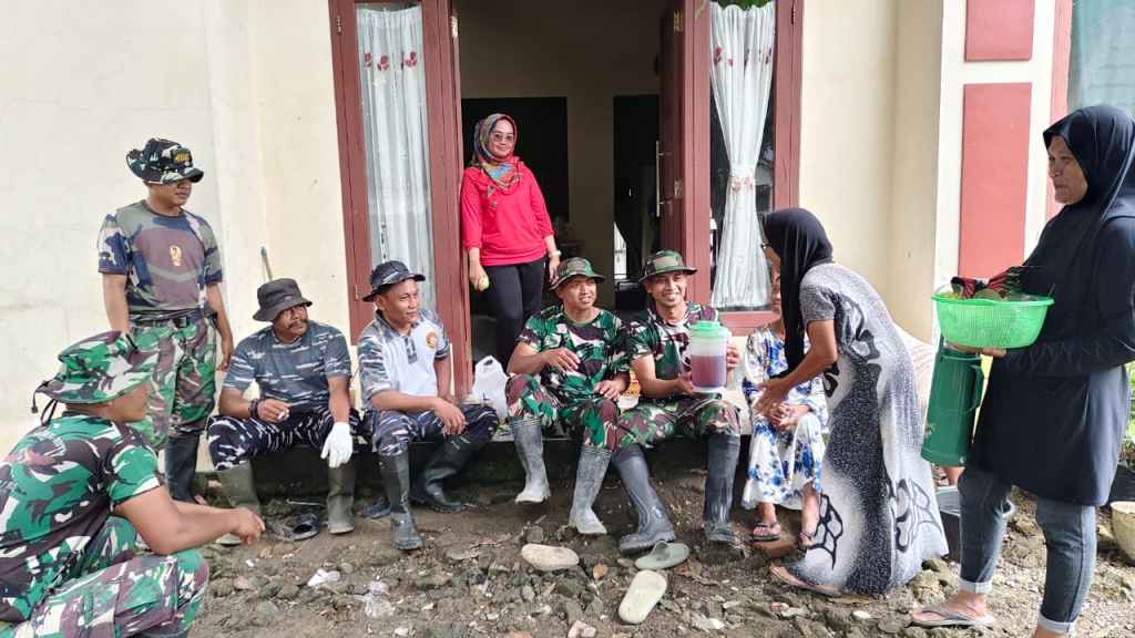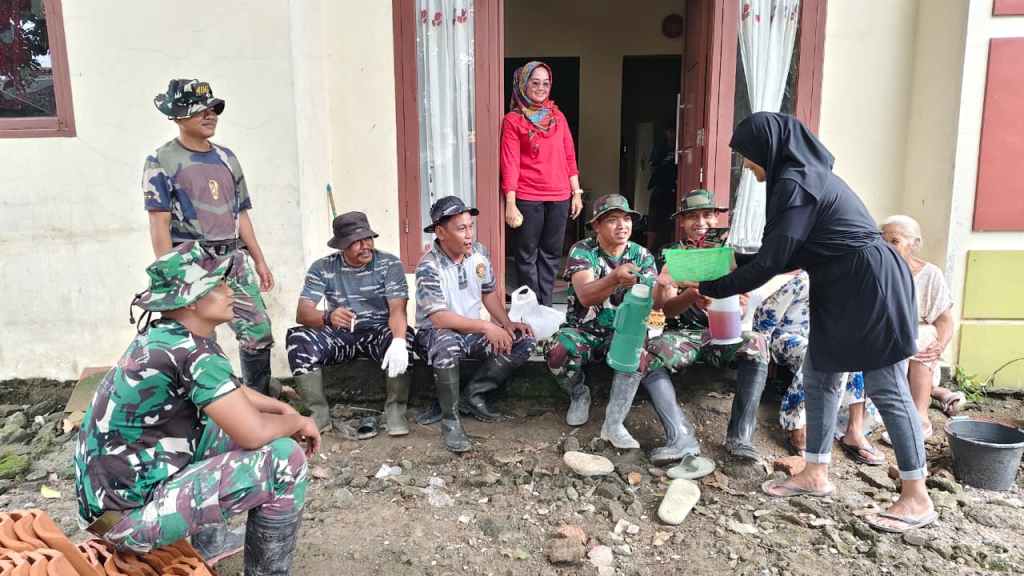 Dua orang ibu rumah tangga, Ibu Suparti (45) dan Ibu Waryunah (49), tampak berjalan menuju titik pengerjaan sasaran fisik sambil membawa satu teko besar teh manis hangat dan kopi untuk dibagikan kepada para prajurit yang sedang melepas lelah.