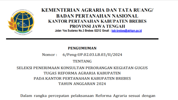 SELEKSI PENERIMAAN KONSULTAN PERORANGAN KEGIATAN GUGUS TUGAS REFORMA AGRARIA KABUPATEN PADA KANTOR PERTANAHAN KABUPATEN BREBES TAHUN ANGGARAN 2024